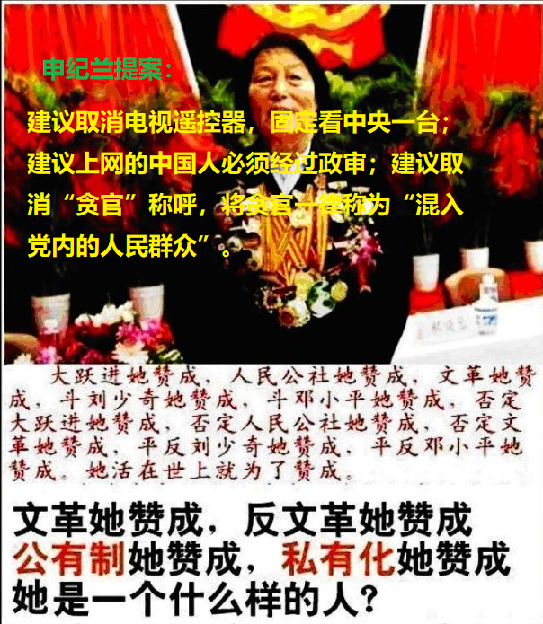 法广说,刷爆网路的一张图片是连任了十三届人大代表申纪兰在举手头赞成票,图片上摘录了她过往的人大提案,如:建议取消电视遥控器,固定看中央一台;建议上网的中国人必须经过政审。建议取消“贪官”称呼等。