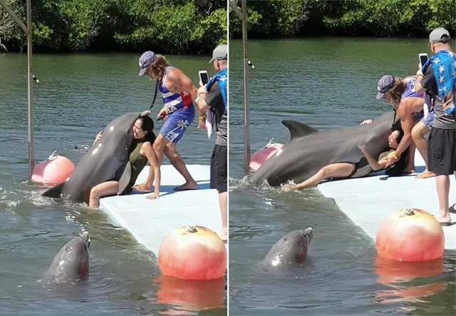 影片中,女游客被海豚袭击时惊叫出声,之后又是无奈、又是好笑地倒地接受这一切,还好海豚只花了10秒钟左右就结束退回水中。一边的男工作人员则抛出饵食吸引海豚退远一点,并察看一下女游客的情况。