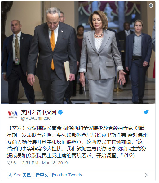 美国国会众议院议长南希·佩洛西和参议院少数党领袖查克·舒默星期一发表联合声明,要求联邦调查局局长克里斯托弗·雷对佛罗里达州的女商人杨莅(Cindy Yang)展开刑事和反间谍调查。