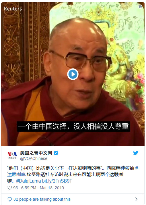 83岁的达赖喇嘛3月18日在接受路透社采访时表示,中国对下一世达赖喇嘛的关注要多过他本人。他说,未来如果外界看到两位达赖喇嘛,一位在印度这样一个自由国家,另一位由中国挑选,那无人会相信,无人会尊重中国的。这对中国是又一个问题。这是可能发生的。