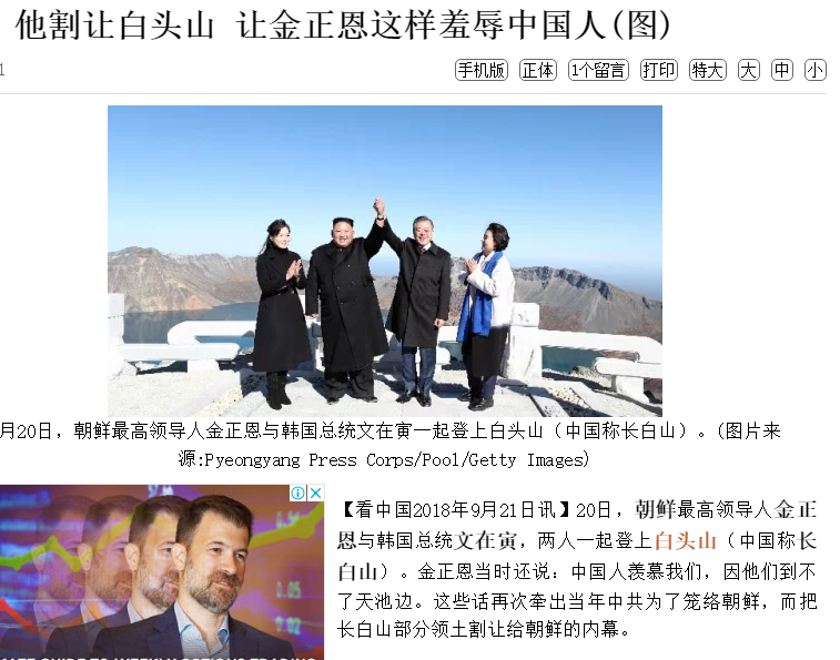 朝鲜领导人金正恩与韩国总统文在寅,于20日一起登上白头山(长白山)。金正恩说:中国人羡慕我们,因为他们到不了天池边。此番话再次牵出当年中共为笼络朝鲜,将长白山部分领土割让给朝鲜的内幕。