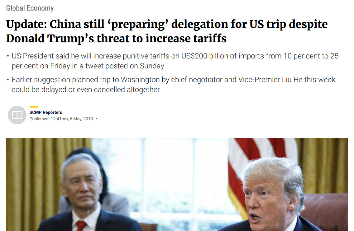 周三(5月8日),联邦公报发布通知,美国将自周五(5月10日)将2000亿美元中国产品的惩罚性关税从10%提高到25%。