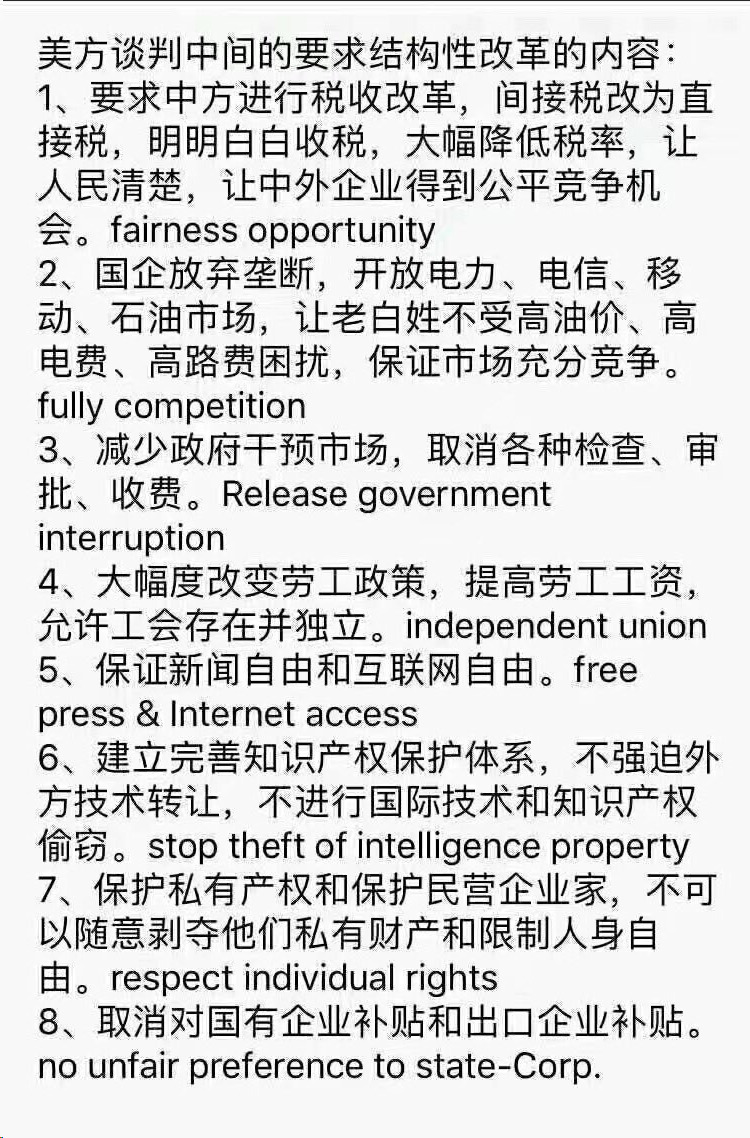 美国要求习近平减税,增加劳工工资,放弃国企垄断和高速公路免费,减少各种政府审查,取消国企补贴,保护私有产权及保护知识产权 中国记忆 10 5 月, 2019 美中超限战 美国要求中国减税,增加劳工工资,放弃国企垄断和高速公路免费,减少各种政府审查,取消国企补贴,保护私有产权及保护知识产权 贸易谈判内容 本文内容除特别注明外均取自各新闻媒体(本站底部列表)和youtuber twitter(x),chatgpt, gemini, 并不代表本站立场! 评论不允许人身攻击。 Posted in 美中超限战Tagged 免费, 减税, 国企, 垄断, 审查, 工资, 知识产权, 私有产权, 补贴, 高速公路Related Posts 王小洪被审查期间被张又侠查出18年肺癌 再有28名将军被查其中包括习近平义子钟绍军!多省现大量军车移动,高铁上坐满军人 内战爆发!上百将军被排队审查,多省现大量军车移动,高铁上坐满军人 出轨CEO的人力资源部女总裁克里斯汀手带婚介有两个孩子,丈夫是知名品牌老板 美国CEO出轨为何火爆全球?与中国国企小三同理 云南全省停发公务员工资 微博审查美国使馆言论可能引起美中外交战,中国网友为美国叫好! 台湾大选中国启动最严审查,俄媒不审流量爆棚;投票女娃爆红 朝鲜遭殃 中国云南停发公务员工资, 多个经济大省曝财政危机 国企副总装修豪宅拖欠装修款 夫妻两个双双被砍头 国企北京建筑设计院大裁员,被辞女职员跳楼身亡 中共国企援助俄罗斯,老美天真的认为中共政府不知情