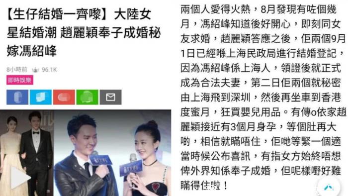 此前,港媒曾爆料赵丽颖和冯绍峰已经奉子秘密成婚,早在9月1日就在上海民政局领取了结婚证。第二天就飞往香港度蜜月,购买婴用品。而赵丽颖和冯绍峰在9月3日也的确现身香港购物,与这篇报道不谋而合。只不过这次爆料依旧没有得到官方证实,但两人结婚的消息也并非空虚来风。