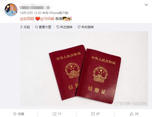 10月10日有网友在社交平台上晒出了疑似二人的结婚证,并公开艾特两人,引来大批吃瓜群众围观感觉太突然了,表示不可思议,就这样曝光结婚证了?