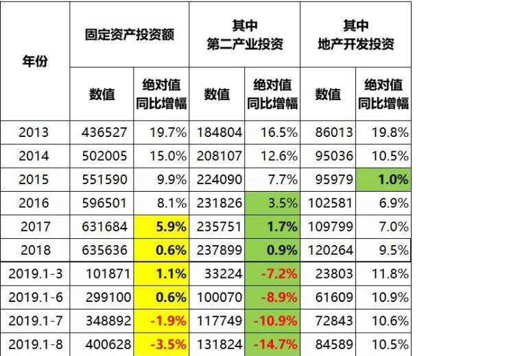 毫无疑问,这又会导致固定资产投资数据的加速下滑。体现在数据上,就是全中国固定资产投资的原始增幅,2017年还有5.9%,2018年下降到0.6%,到今年1-8月,已经下降到-3.5%。注意,这是一个负值。