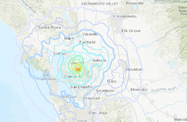 根据美国地质局报告,核桃溪和愉快山地区感觉到中等程度的晃动,旧金山、奥克兰和圣何塞地区感觉到微弱的晃动。