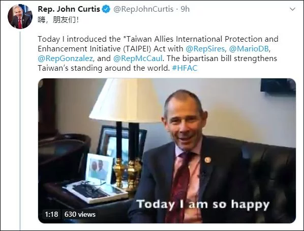 据美国之音报道,美国参议院外委会上月25日已经通过「台北法案」。18日,美国共和党籍外交关系委员会亚太小组成员柯蒂斯发布推文,说他与美国众议院外委会其他4名议员,共同提出“台湾友邦国际保护暨强化倡议法案”(即“台北法案”),“旨在强化台湾的国际地位”,并应对“来自中共的压力”。