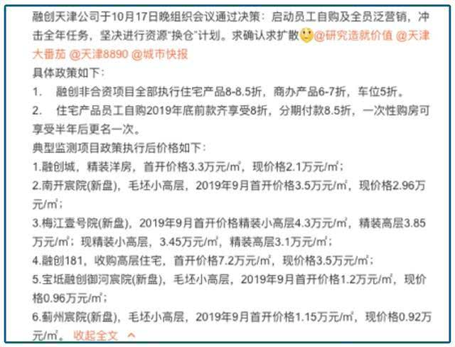 据大陆财新网消息,融创中国在当地的降价策略已于上周开始实施。有业主表示,他于9月中旬在该楼盘购买了一套高层住宅,单价为1.6万元/平方米,但上周末(10月19、20日),楼盘推出几栋相似的高层住宅,单价降至1.2万元/平方米,整体降幅达30%,但该楼盘周边项目未见如此大的降价幅度。