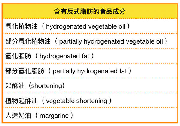 购买食品注意食品成分,最好避开或少吃有反式脂肪的食品。(大纪元制表)