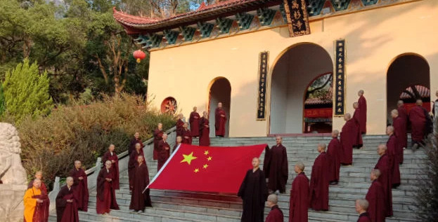 根据《寒冬》报导,中共十一当日,中国河南省禹州市梁北镇关圣禅院内,法师带领著众信众高呼爱国口号:「爱国爱教,不忘初心,共筑中国梦」。紧接著,众信徒聚集在旗台旁,进行升国旗仪式,众僧人、信徒摇舞著小红旗、高唱国歌。