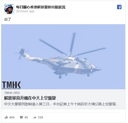 脸书专页“每日关心香港解放军的出动状况”引用香港网路媒体“TMHK”的消息称,“中文大学警民对峙进入第三日,上午十时许于大埔公路上空发现有多架直升机低飞盘旋”,其中“至少有一架解放军直升机在场”。