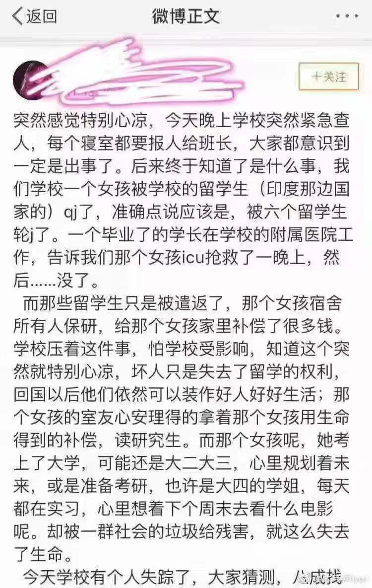 中国大学频繁发生留学生轮奸女大学生情况,学校总是私下和解然后和警察结合逮捕发布新闻的人