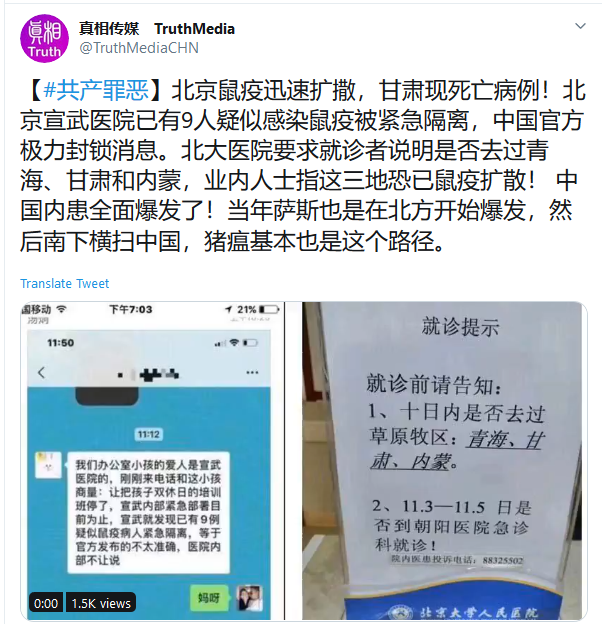北京鼠疫迅速扩撒,甘肃现死亡病例!北京宣武医院已有9人疑似感染鼠疫被紧急隔离,中国官方极力封锁消息。