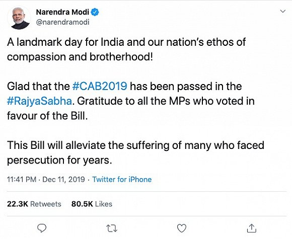 12月11日,印度议会联邦院(即上议院)以125对105的票数,通过了一份公民法修正案(Citizenship Amendment Bill) 。根据这份修正案,在2014年12月31日前,因受宗教迫害从阿富汗、孟加拉国和巴基斯坦逃入印度的宗教少数群体均可以申请加入印度籍,包括佛教徒、基督徒、印度教徒、耆那教徒、帕西斯派和锡克教徒移民,而伊斯兰教被排除在外。