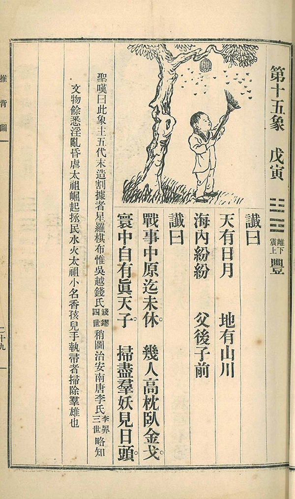 图中一小孩儿手执扫帚横扫群蜂,与颂中“扫尽群妖见日头”相应。宋太祖小名“香孩儿”,故图中以小孩儿暗喻。