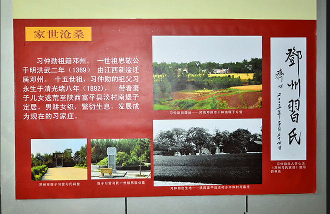 1958年6月15日,时任国务院秘书长的习仲勋,随周恩来到十三陵水库工地劳动,休息时谈到了河南。他说:“我的祖籍在河南邓县(1988年改为邓州市)。是时,祖父只有二亩半地,日子过得很苦,加之天灾、匪祸不断,全家逃到了陕西富平。”图为:习氏宗祠的“习仲勋纪念馆”