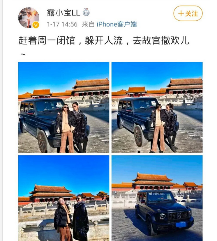 1月17日14时56分,有一名网名叫:“露小宝LL”的网友,在微博晒了一组照片。照片里有两名年轻女子在一辆大G前合影。该网友并配了这样一句话:“赶着周一闭馆,躲开人流,去故宫撒欢儿~”。
