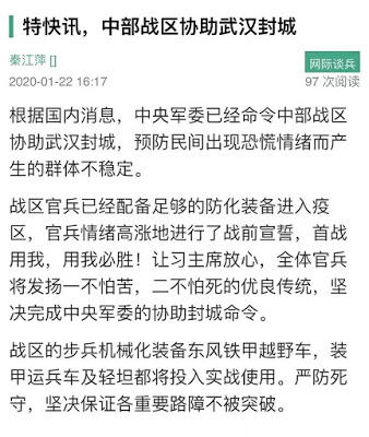 网上有传,中共中央军委已经命令中部战区协助武汉封城,预防民间出现恐慌情绪而出现群众运动,甚至言之凿凿,军队配备化装备,出动装甲运兵、轻型坦克。但有关消息未获当局证实。