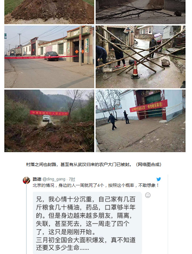 近日来,网上广传各地封路的大量照片和视频,最初是与湖北省相邻的河南、江西等省份,民众和地方政府自行制造路障,甚至调来挖土机挖开道路,以阻止武汉和湖北省的车通过,河南到湖北的所有大路和乡村小道全部挖断。