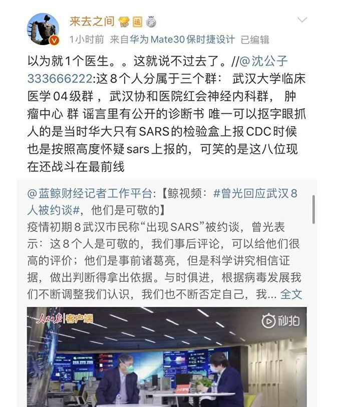 武汉肺炎疫情爆发初期,武汉有8人因称“出现SARS”,被中共当局以“散播不实消息”为由约谈。随着疫情一发不可收,外界纷纷怀念这8名勇敢任事者。
