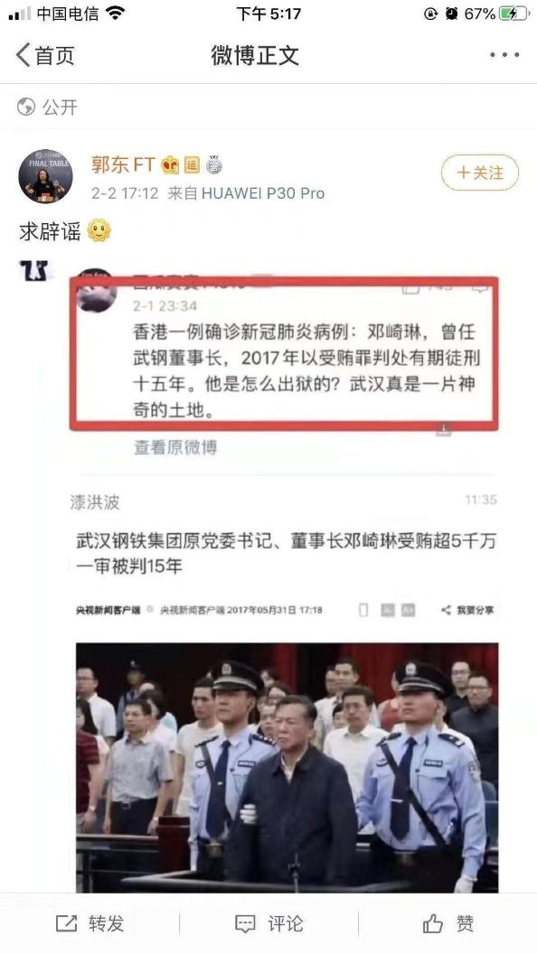 • 邓琦琳乃武钢集团董事长,2017年因为受贿超过五千万判刑15年 今年在香港确诊患了武汉肺炎 – 咋越狱的?