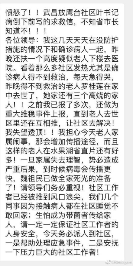 消息称,这是武昌水果湖放鹰台社区叶书记病倒下前写的求救信。这位叶书记在求救信中说:自己近些天每天在没防护措施的情况下和确诊病人一起,就在一天前还扶一个高度疑似老人下楼去医院。看着那么多社区发热尤其是确诊病人得不到救治,每天急得哭。