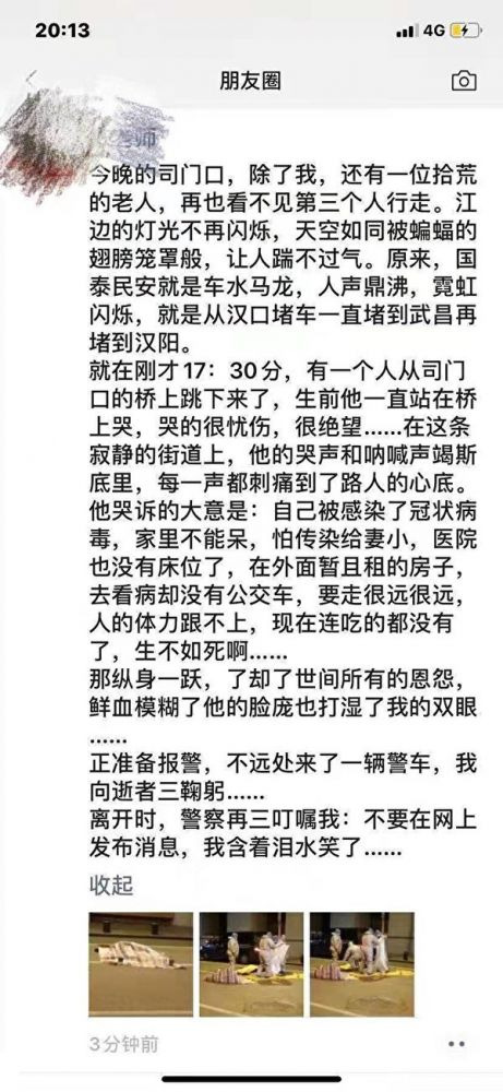 一名目击者转述了这名跳桥男子生前绝望的哭诉内容:自己被感染了冠状病毒,家里不能呆,怕传染给妻小,医院也没有床位,在外面暂且租的房子,但去看病却没有公交车,要走很远很远,他的体力又跟不上,现在连吃的都没有了,生不如死啊