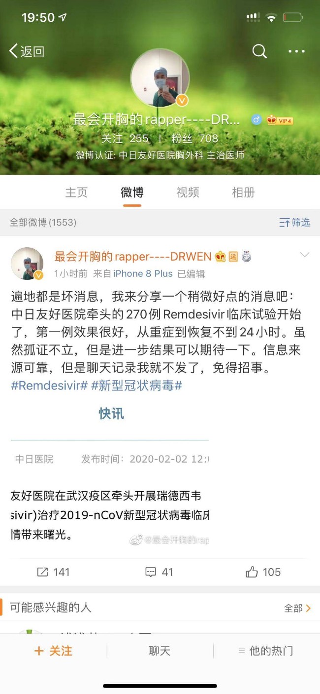 中日友好医院牵头的270例瑞德西韦治疗新冠病毒临床研究试验,效果非常好,第一例从重症到恢复不到24小时,虽然还没得到官方证实,但是值得期待。
