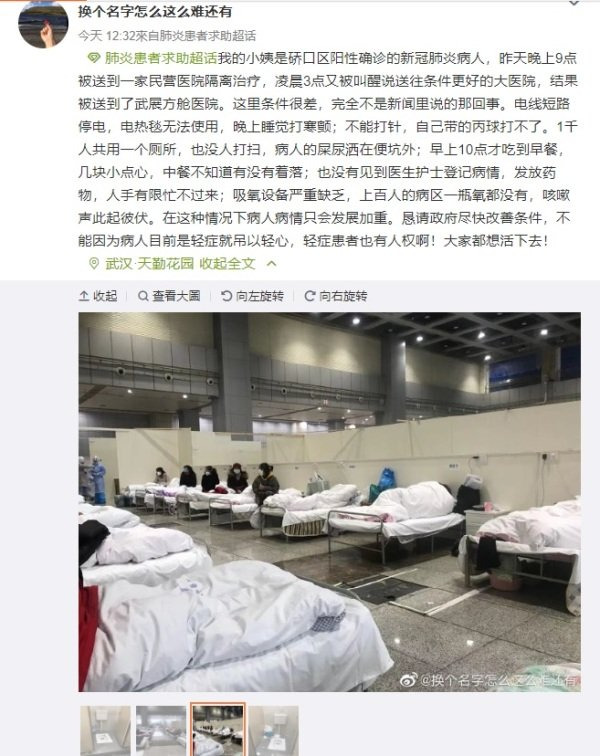 有网友在微博披露,他的阿姨是新型冠状肺炎病人,在6日凌晨被通知要送往“条件更好的大医院”,结果却被送到武汉客厅会展中心建成的方舱医院。他抱怨道:“这里条件很差,完全不是新闻里说的那回事。电线短路停电,电热毯无法使用,晚上睡觉打寒颤;不能打针,自己带的丙球(静脉注射免疫球蛋白)打不了。1千人共用一个厕所,也没人打扫,病人的屎尿洒在便坑外。”