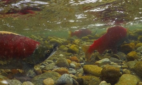 这些红鲑鱼,要从海上游大约 450 公里,途径弗雷泽河和汤普森河,然后找到自己的出生地,在产卵后死亡。