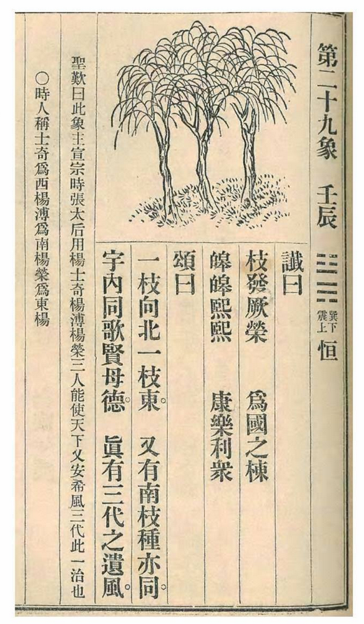 “枝”:指三杨。“厥”:音决,字意为“其”。第21象出现过,作拆字迷:“厥”有宫门大开之意,因“阙”(音却)是指宫门,“阙”无门,厂开了就是“厥”字。这里似喻仁宣之治时,朝廷言路大开,从谏如流——当然,这是三杨劝谏仁宗、宣宗的功劳,故曰“枝发厥荣”。