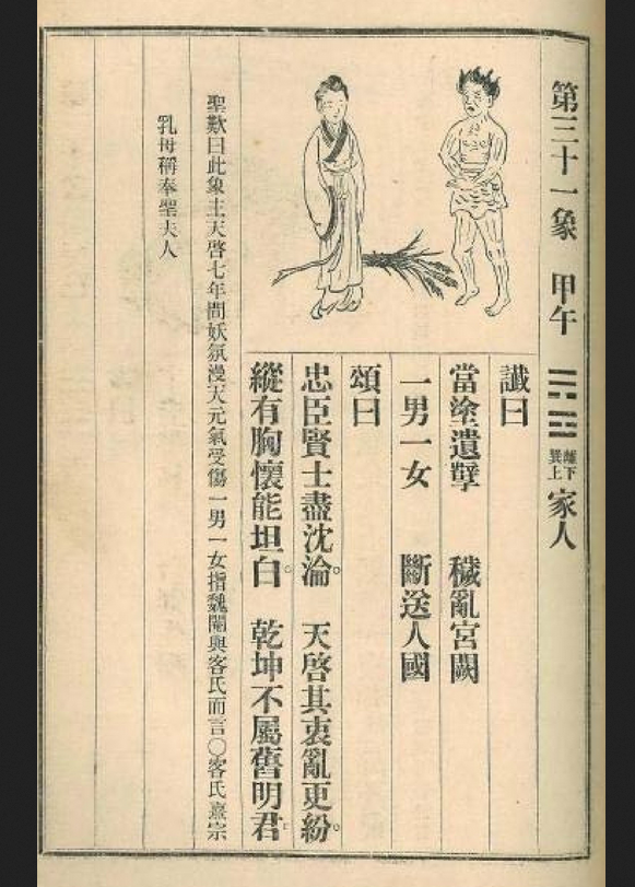金圣叹:“此象主天启七年间,妖气漫天,元气受伤。一男一女指魏阉与客氏而言。魏杀客氏,客氏熹宗乳母,称奉圣夫人。”