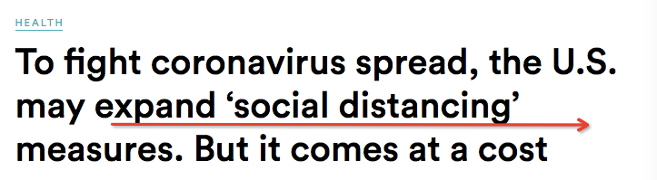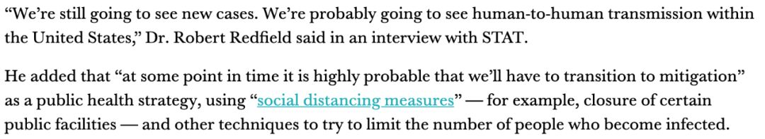 CDC建议实行“社交隔离”之前,美国公共卫生官员还表示,“对美国的威胁仍然很小”,“不建议采取其他预防措施,例如取消活动或避免外出”。但随着疫情的进一步扩大,美国疾控中心主任Dr. Robert Redfield表示,“在某些时候,我们很可能需要采取一些措施”,“使用社交隔离措施(Social Distancing Measures),例如关闭某些公共设施等方式来限制被感染的人数”。