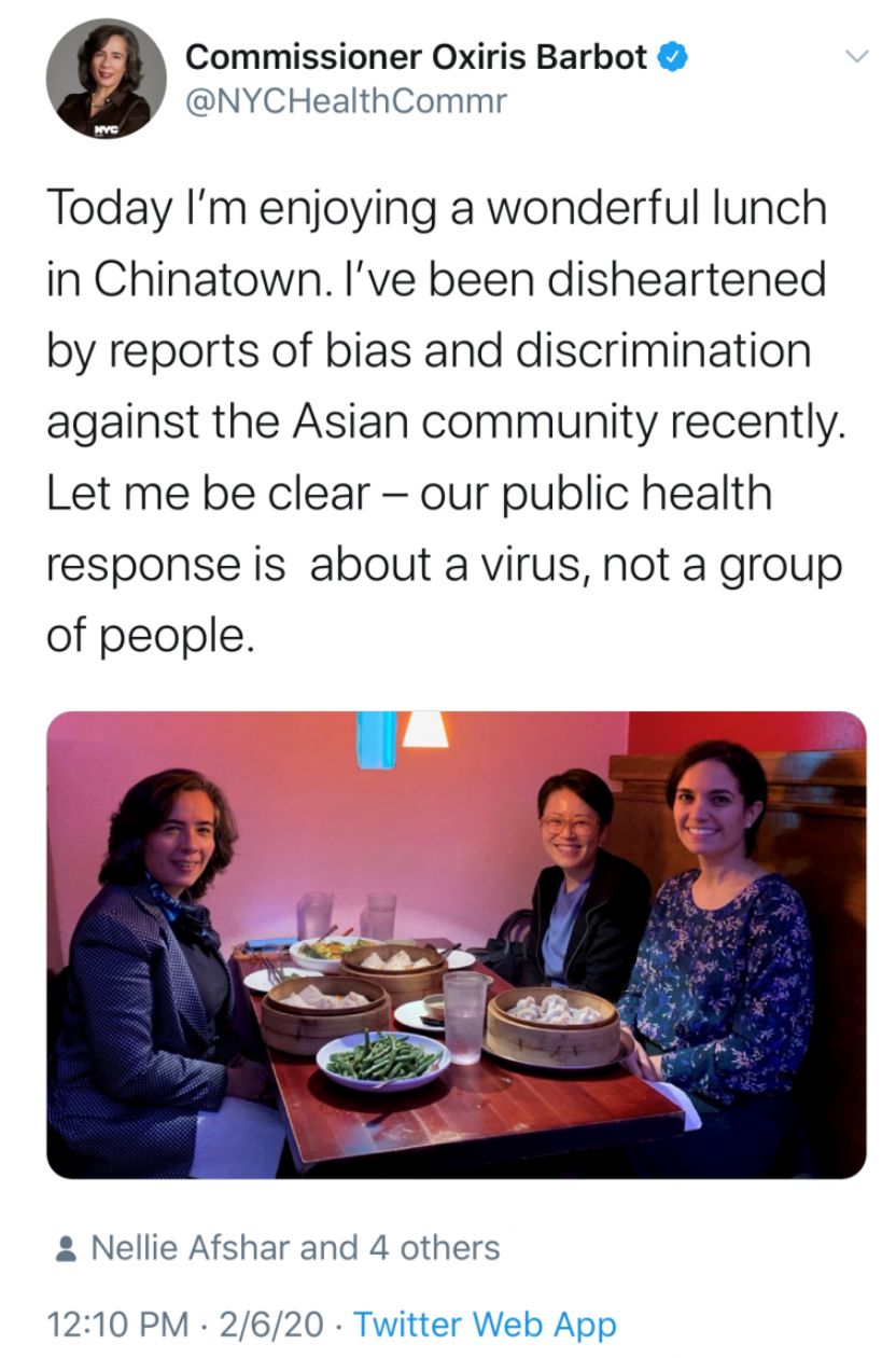 危急关头这些人都在力挺中餐厅!力挺华人社团!不过,在这危急关头有些人站了出来,力挺华人社团,力挺中餐厅!2月6日纽约市卫生局长Oxiris Barbot表示,自己在曼哈顿唐人街享用午餐。“我对最近一些针对亚洲社区的偏见和歧视性新闻报道感到沮丧。我要再一次声明——我们的公共卫生应对措施是针对一种病毒,而不是针对一群人。”