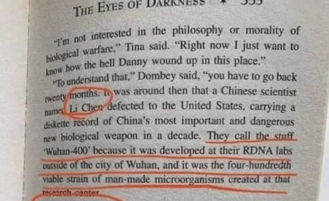 In chapter 39 of his book, Koontz writes that the lab is located in Wuhan, which lends the virus its name, Wuhan-400.