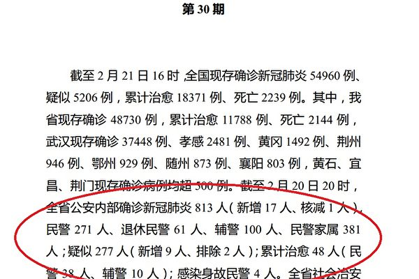 该简报还披露,截至2月20日20时,全省公安内部确诊新冠肺炎813人(新增17人、核减1人),疑似277人(新增9人、排除2人),感染死亡警察4人。