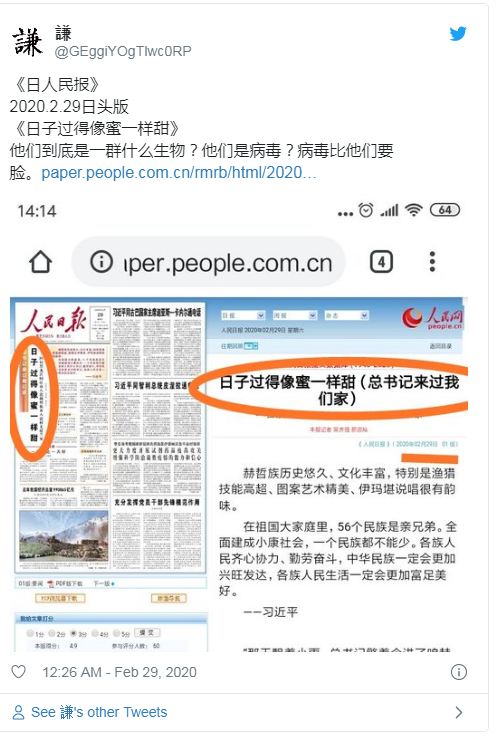 推特网友今天贴出《人民日报》第一版,头条赫然是《日子过得像蜜一样甜》。网友称:“咋不去武汉看看呢!”