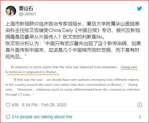 截止发稿前,相关的报道可在《中国日报》的英文版China Daily上查到,标题为“Expert: Control of virus within reach(专家:控制病毒触手可及)”。在回应有关病毒是否源自国外的问题时,张文宏在最新的采访中认为该病毒起源于武汉。