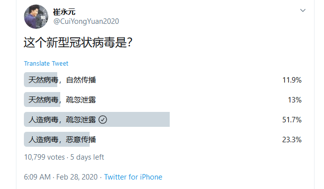 上述结果可见,武汉新冠病毒来自实验室的阴谋论远未消除,小崔自己的观点也就在其中。有评论指出,要澄清此事,追究真相,须有一个公正可信的强有力第三方独立调查。追究真相不仅为了武汉,湖北,中国,世界在这场疫情中死去的人,也为活下来的人能更加安全的生活下去。
