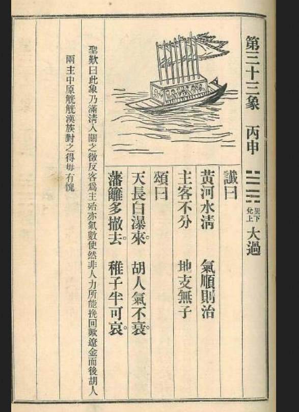 本卦大象:“中间四阳爻,为结实之梁,但初末为阴爻,力弱不支,则势将摧折”。运势:“有力不从心,负担过重之象,多烦恼,防官非及水险”。卦象演化也如清朝国运:初期国力弱,中期强,后期官僚腐败,是为“官非”;被海外列强欺凌,是为“水险”;对外不断割地赔款,是为“负担过重之象,多烦恼……势将摧折”。