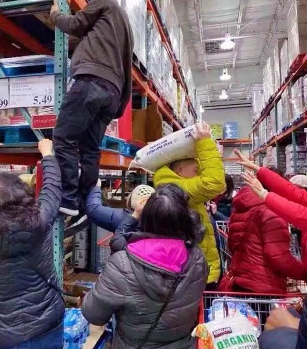 抢粮吗?必须出手快,几个人出手都快,还都抓住一袋大米的一角,就形成拔河比赛的场面,岂不是更加剧抢的效果和抢的热情了吗?就这一袋米,抢粮是为了争口气,意义变了,抢不到的人就会制气,就会发牢骚甚至会骂?互骂就会转变成打,打起来有可能就会砸点东西吓唬一下别人壮一下自己的威风,哪怕扔出一片报纸和卫生纸也能发泄一下气愤,这就形成了打砸抢的局面。这种局面人的动态能美观吗?抢的时候动作是不是很丑,很夸张变形,让西人怎么想?其它族裔看?让那些正常买食物的华人怎么能不难堪?歧视华人吧?人家西人都有这个素质不想歧视华人。甚至有华人的西人邻居,互相聚会的时候也问过,早就知道华人抢盐的事情,也就知道了中国人过去穷怕了,烙下了病根,人家表示理解。但百闻不如一见呀?西人也听政府的,解读得到位,出来适当买些必用品,属于正常现象。不料,哎呀我的妈!百闻不如一见,原来华人是这样抢粮的?和群殴有过之而无不及……