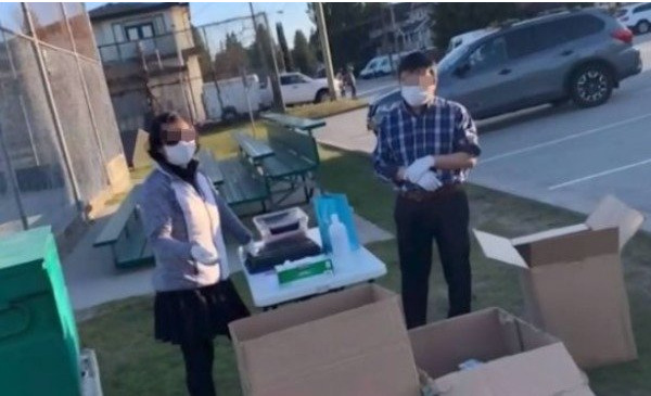加拿大一户华人家庭竟然在麦克林公园旁摆起路摊,高价倒卖口罩。(网络截图)