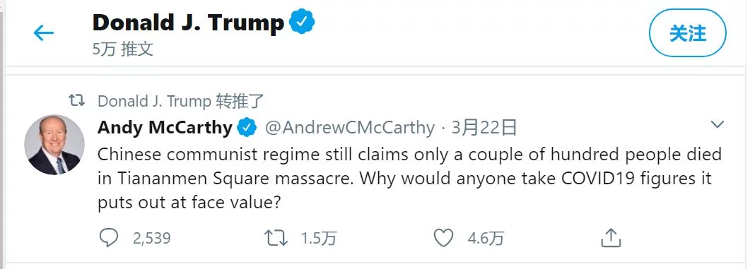 美国前助理检察官、专栏作家安德鲁·麦卡锡(Andy Mccarthy)3月23日发推文说:“中共政权现在还声称,天安门广场屠杀只死了几百人。为什么有人会相信中共公开的新冠病毒感染人数?”