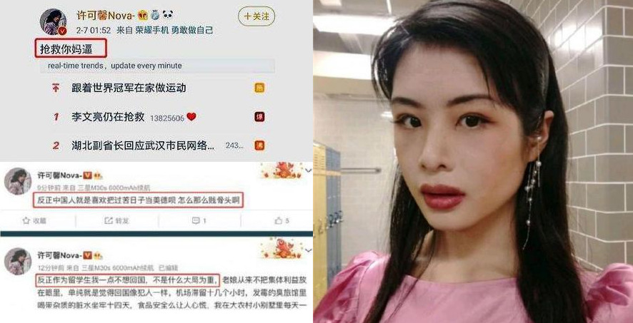 《联合早报》已无法在微博上找到名叫“许可馨 Nova-”的账号,但综合江苏新闻广播和《明报》报道,“许可馨 Nova-”发文称“反正中国人就是喜欢把过苦日子当美德呗,怎么那么贱骨头啊”“如果我有医生朋友在武汉一线,我会希望他们临阵脱逃”“反正作为留学生我一点不想回国,不是什么大局为重”,引起其他网民热议。