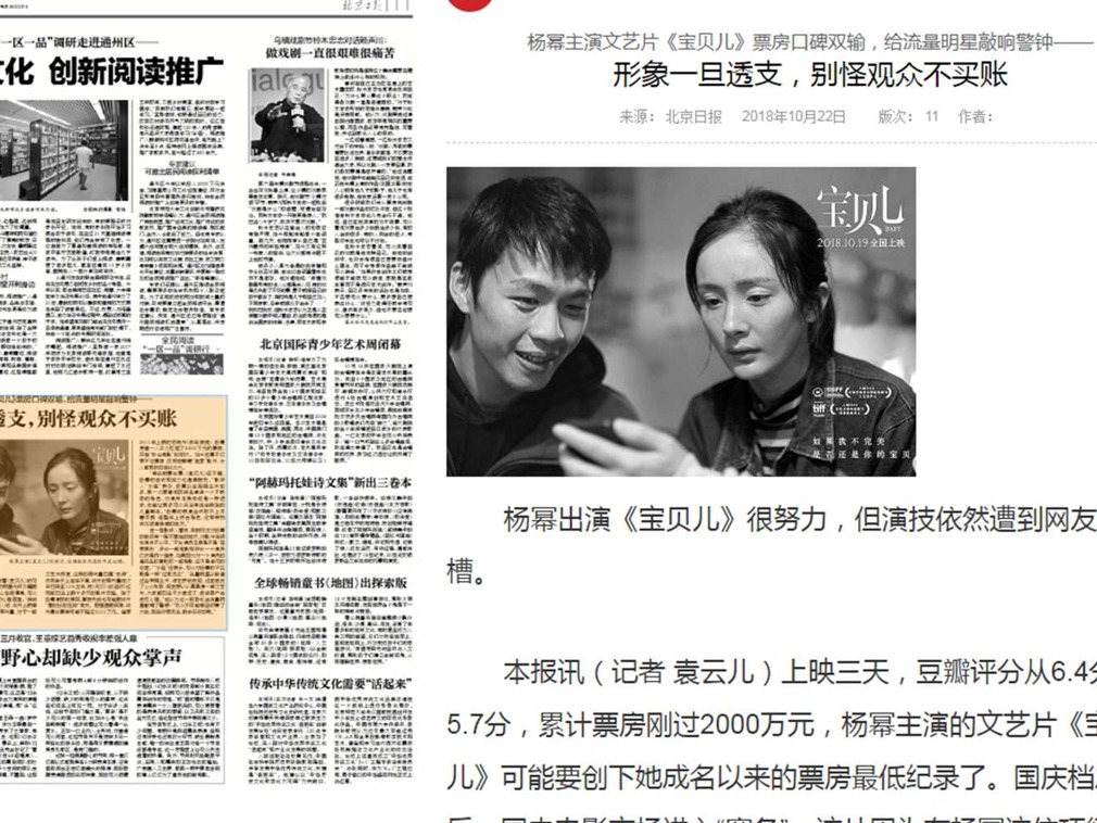 北京时间10月22日,北京市委机关报《北京日报》发布《形象一旦透支,别怪观众不买账》的评论文章,主要涉及的电影就是10月19日上映,由杨幂主演的电影《宝贝儿》。