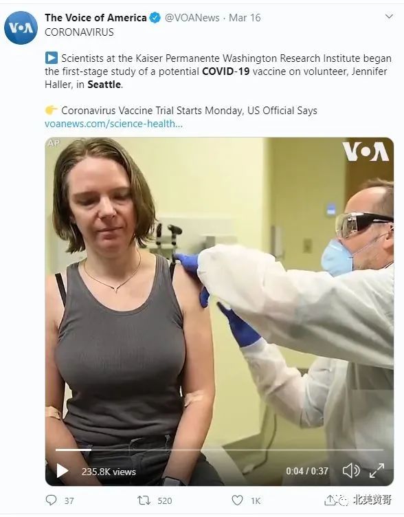 图:美国华州开始了疫苗的人体注射