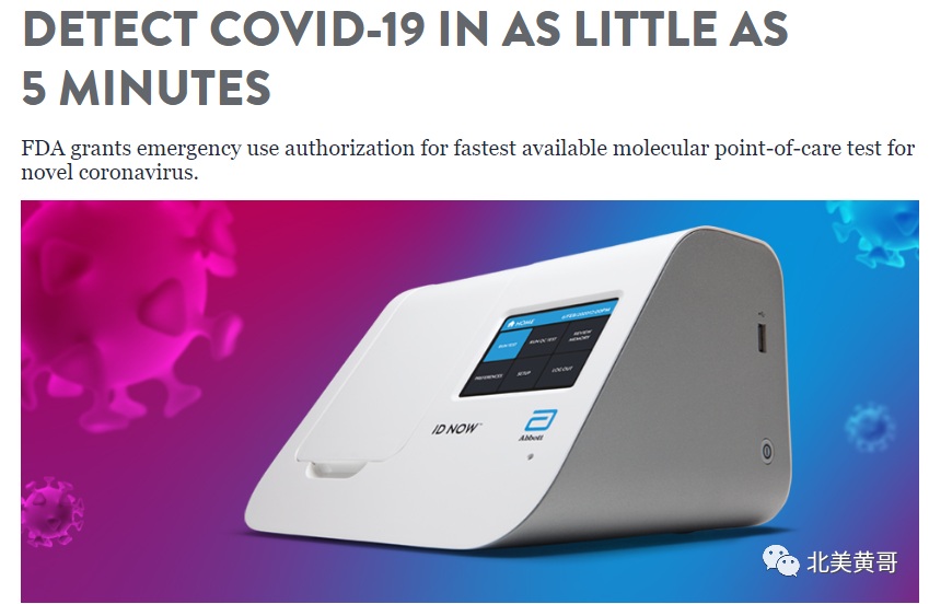 雅培(Abbott)快速检测仪ID NOW,机器只有6磅重,可以用于各种场合。一滴血,阳性结果5分钟可以出来,阴性结果13分钟出来。