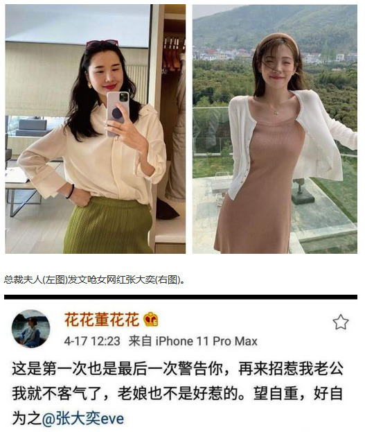 中国淘宝、天猫事业群总裁蒋凡老婆近日以网名“花花董花花”微博公开呛声女网红张大奕,更发狠呛声警告:“这是第一次也是最后一次警告你,再来招惹我老公,我就不客气了,老娘也不是好惹的。”