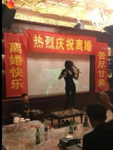 中国微博上出现一影片受到网友热烈讨论,影片里正在举办离婚派对,并挂有”热烈庆祝离婚、离婚快乐、苦尽甘来”的布条;身为派对主角的少妇在舞台上热舞,拿着酒瓶大声说到”今天是我离婚的第1天,希望大家吃好、喝好、玩好,好不好?”,台下观众也热情回应。